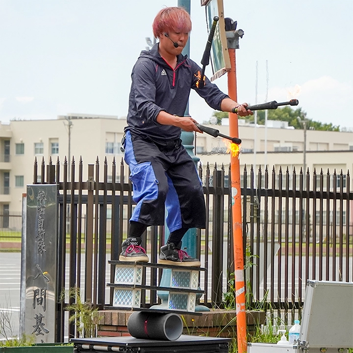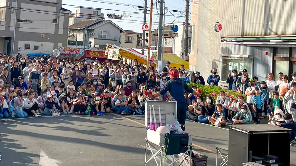 地域の皆が一体となって楽しめる温かく活気ある大道芸パフォーマンス。老若男女を問わず喜ばれる演目で会場を盛り上げ、祭り全体の雰囲気をさらに高める。