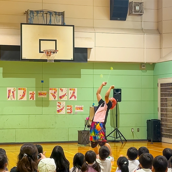 大道芸を通じて子供たちに「挑戦する心」と「表現の楽しさ」を伝える。遊び心あふれるショーや体験コーナーで交流を深め、学びの場に笑顔と感動をもたらす。