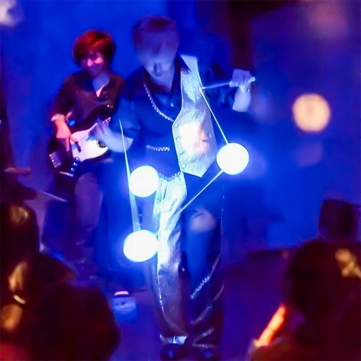 最も得意とするディアボロは、まるで生きているかのように宙を舞う。27年の経験で磨かれた高度な技術とユーモアを交え、観客の心をつかんで離さず、誰もが笑顔になる特別な時間を届ける。