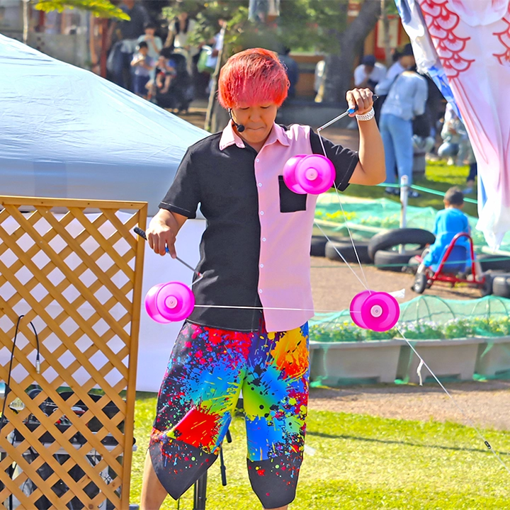 Performer Yu-kiの大道芸パフォーマンスは、さまざまなイベントに合わせて最適な形で提供可能。お祭りや商業施設、学校行事から企業イベントまで、規模や目的に応じて観客を笑顔に導くプランを提案する。