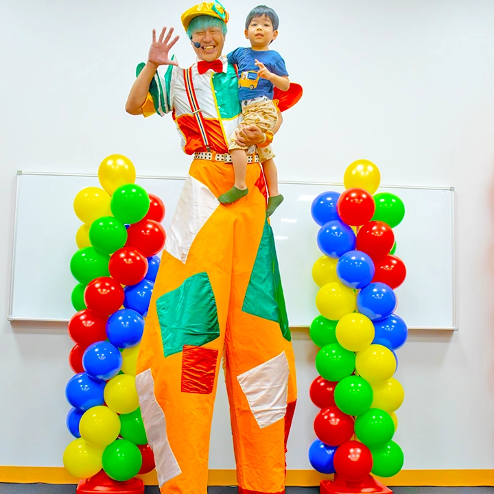 身長2m50cm前後の足長巨人に変身するスティルト。一瞬で非日常の世界を生み出し、驚きと笑顔で観客を包み込む。存在感を活かしたグリーティングに加え、日本トップレベルの技術でダンスや縄跳びなど想像を超える動きを披露する。